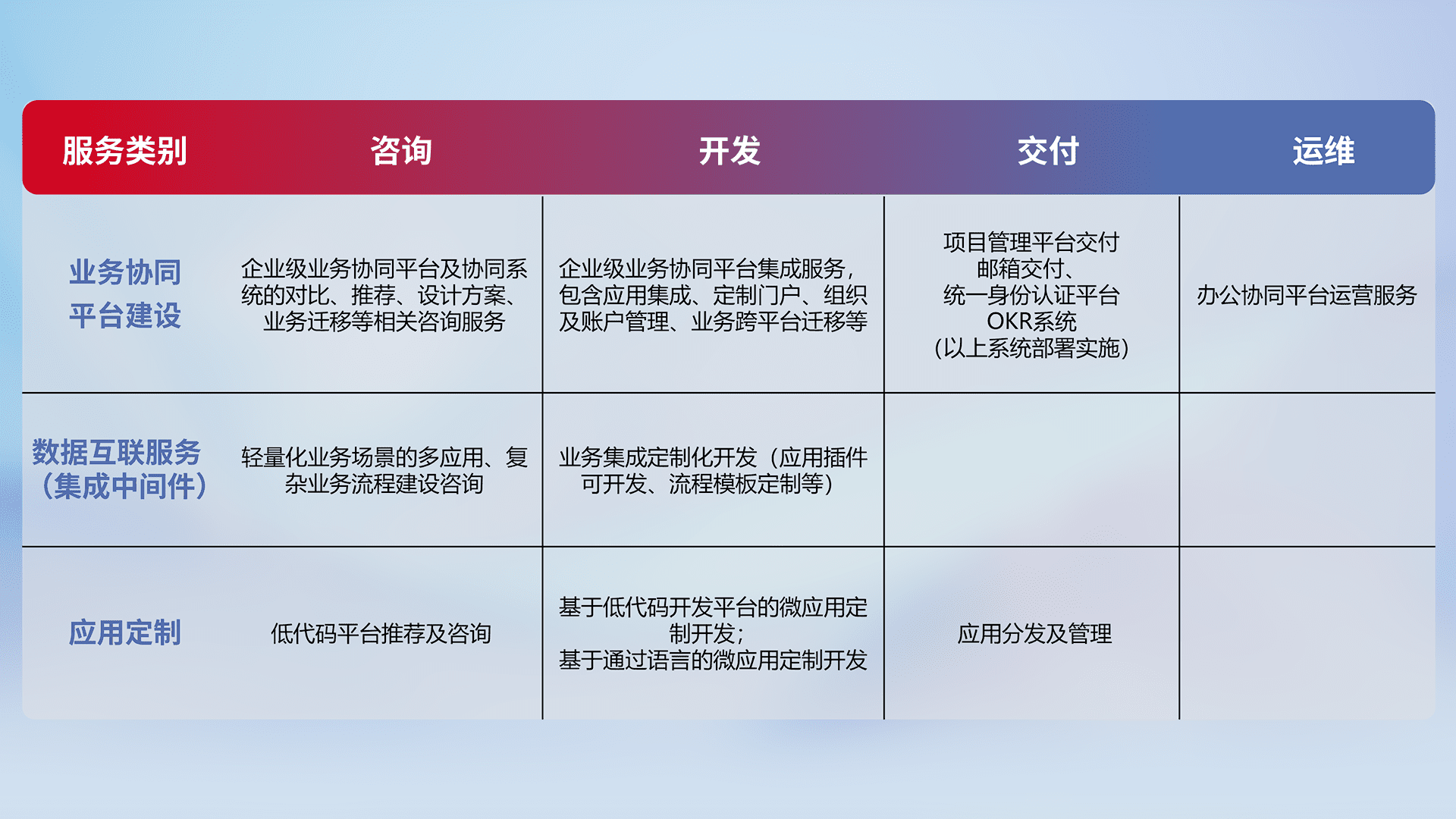 针对钉钉、、、企微、、、、IDaas等平台级产品提供产品的规划、、、、方案、、交付、、、定制化开发等服务,,,实现如统一协同办公、、智能客户服务、、混合会议管理、、智能数据查询、、、等业务场景,,实现数字化转型。。。。