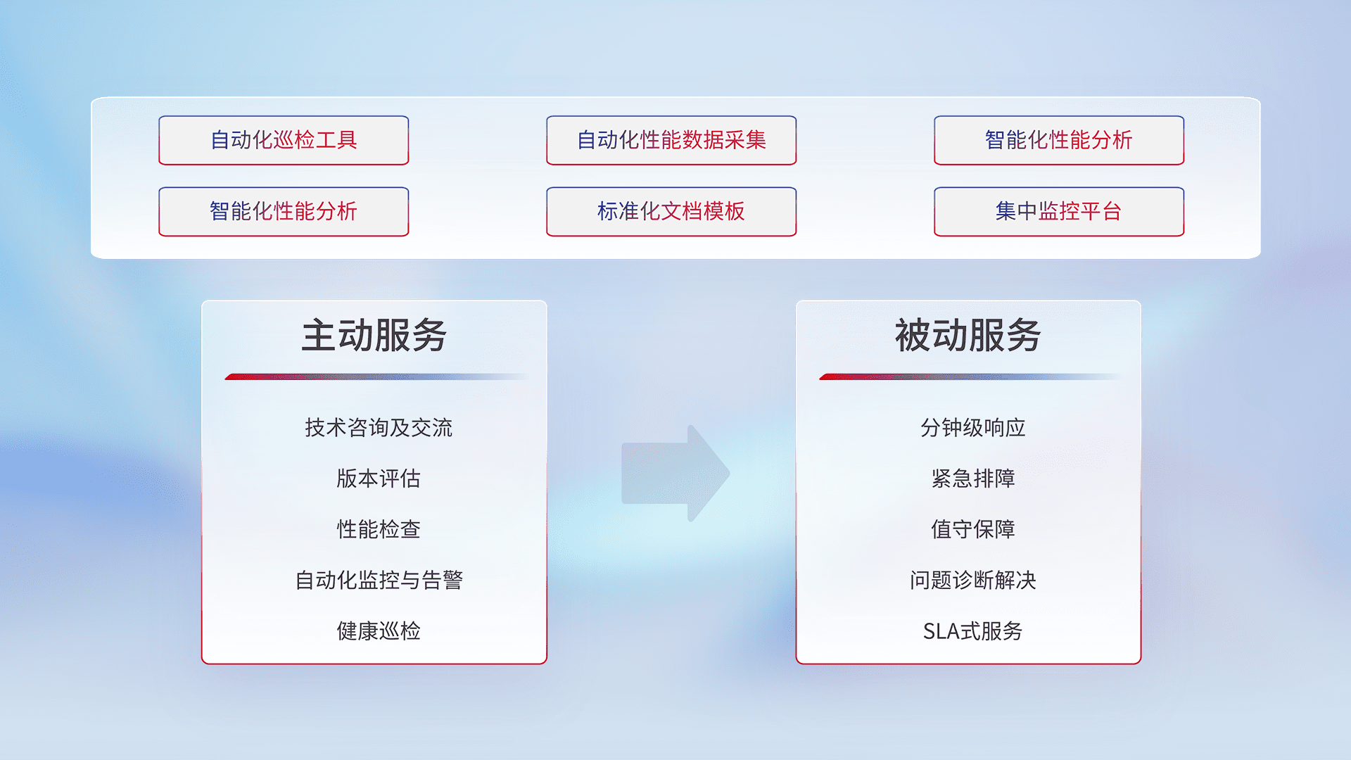 智能化工具和标准化文档,,,,保障服务质量,,提供主动服务(包含技术咨询、、版本评估、、、性能检查、、自动化监控与告警、、健康巡检)和被动服务包含(分钟级响应、、、、紧急排障、、值守保障、、、、问题诊断解决、、SLA服务)。。。